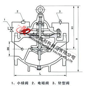 600X水力電動控制閥當閥門從進口端給水時,水流經過針閥進入主閥控制室,當電磁導閥打開時,控制室內的水經電磁導閥打開,球閥流出。球閥開度大于針閥開度,主閥控制室壓力很低,主閥處于全開狀態。